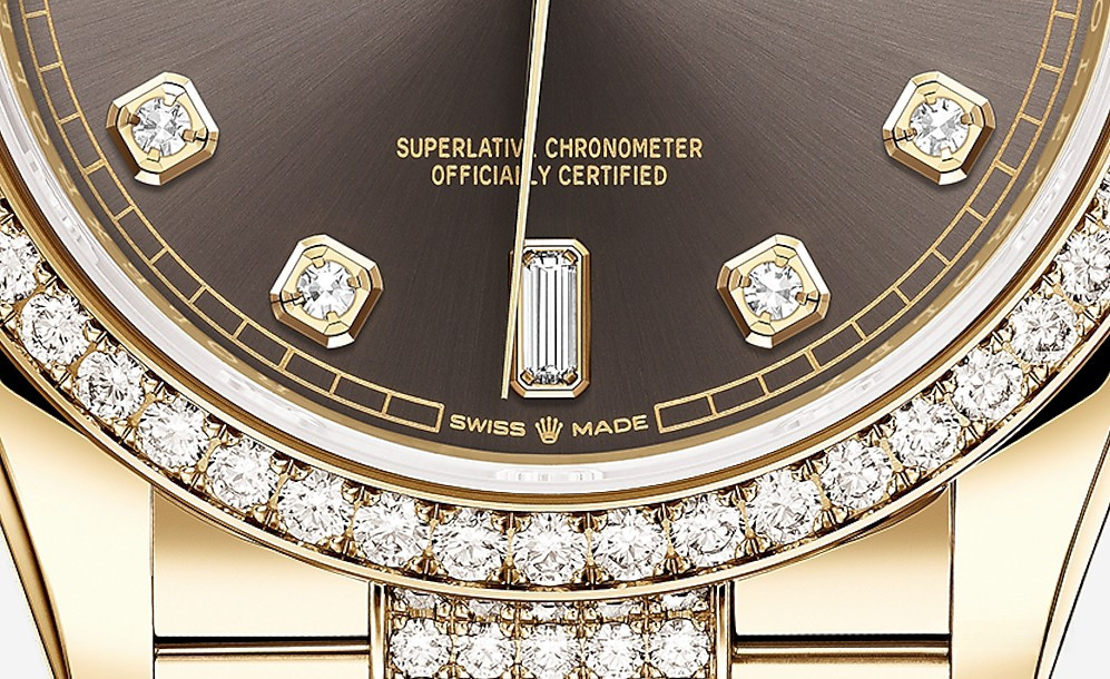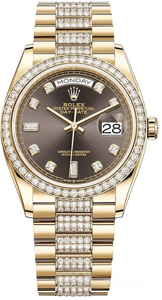 Водостойкие часы Rolex Day-Date Day-Date 36mm Yellow Gold являются официально сертифицированным хронометром COSC, выпущены в круглом корпусе из желтого золота 18к. Размер составляет 36 мм, водонепроницаемость 100 м. Внутри корпуса установлен автоматический механизм. На коричневом циферблате с 10-ю белыми бриллиантами отображаются часы, минуты, секунды, дата, день недели. Часы комплектуются браслетом из желтого золота 18к, инкрустированным белыми бриллиантами. Безель из белых бриллиантов.
