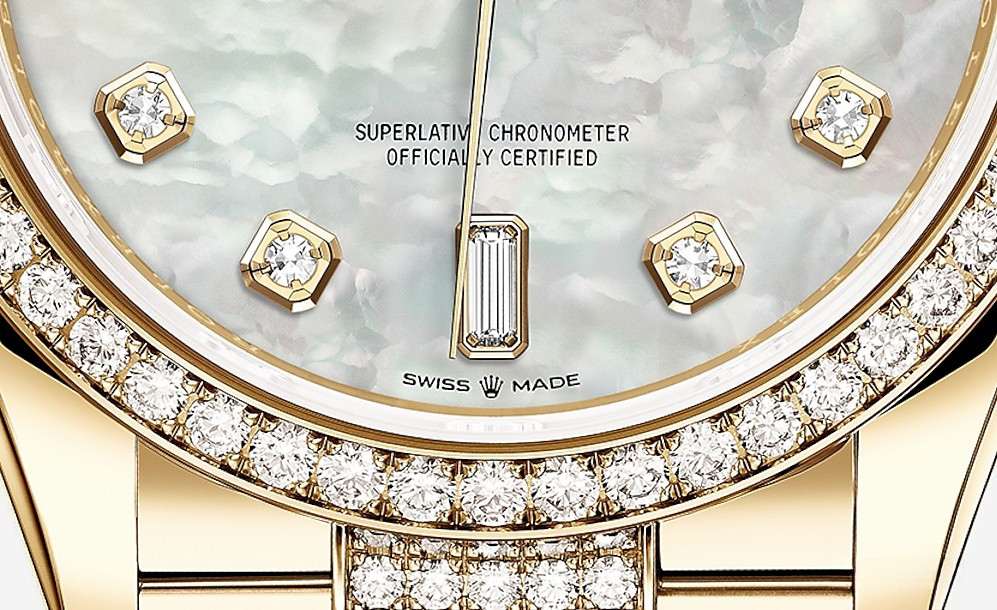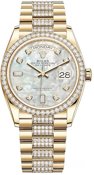 Водостойкие часы Rolex Day-Date Day-Date 36mm Yellow Gold являются официально сертифицированным хронометром COSC, выпущены в круглом корпусе из желтого золота 18к. Размер составляет 36 мм, водонепроницаемость 100 м. Внутри корпуса установлен автоматический механизм. На белом жемчужном циферблате с 10-ю белыми бриллиантами отображаются часы, минуты, секунды, дата, день недели. Часы комплектуются браслетом из желтого золота 18к, инкрустированным белыми бриллиантами. Безель из белых бриллиантов.