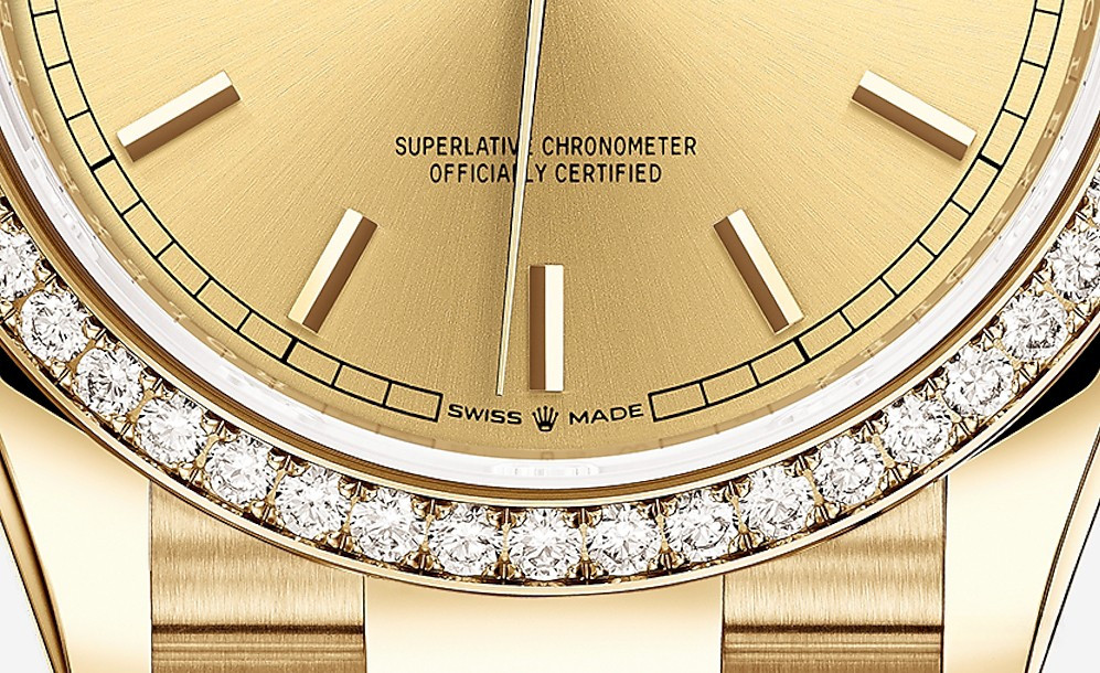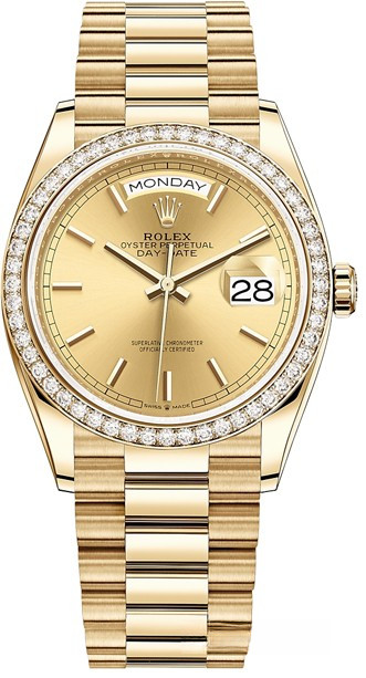 Водостойкие часы Rolex Day-Date Day-Date 36mm Yellow Gold являются официально сертифицированным хронометром COSC, выпущены в круглом корпусе из желтого золота 18к. Размер составляет 36 мм, водонепроницаемость 100 м. Внутри корпуса установлен автоматический механизм. На золотистом циферблате отображаются часы, минуты, секунды, дата, день недели. Часы комплектуются браслетом из желтого золота 18к. Безель из белых бриллиантов.