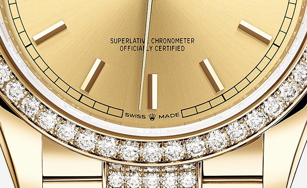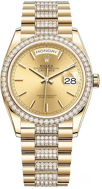 Водостойкие часы Rolex Day-Date Day-Date 36mm Yellow Gold являются официально сертифицированным хронометром COSC, выпущены в круглом корпусе из желтого золота 18к. Размер составляет 36 мм, водонепроницаемость 100 м. Внутри корпуса установлен автоматический механизм. На золотистом циферблате отображаются часы, минуты, секунды, дата, день недели. Часы комплектуются браслетом из желтого золота 18к, инкрустированным белыми бриллиантами. Безель из белых бриллиантов.