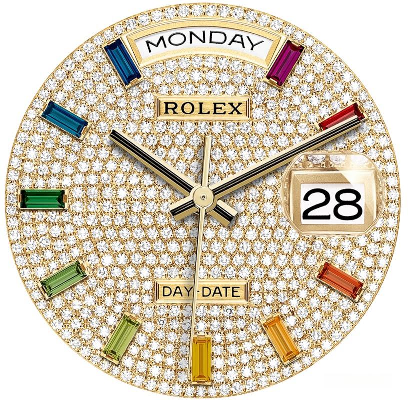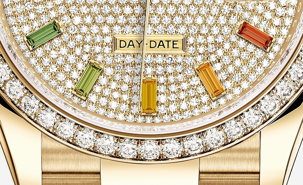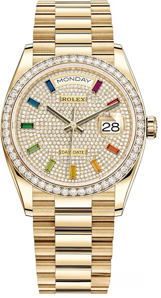 Водостойкие часы Rolex Day-Date Day-Date 36mm Yellow Gold являются официально сертифицированным хронометром COSC, выпущены в круглом корпусе из желтого золота 18к. Размер составляет 36 мм, водонепроницаемость 100 м. Внутри корпуса установлен автоматический механизм. На циферблате с белыми бриллиантами и разноцветными багетными сапфирами отображаются часы, минуты, секунды, дата, день недели. Часы комплектуются браслетом из желтого золота 18к. Безель из белых бриллиантов.