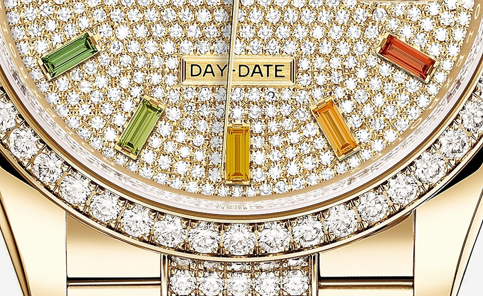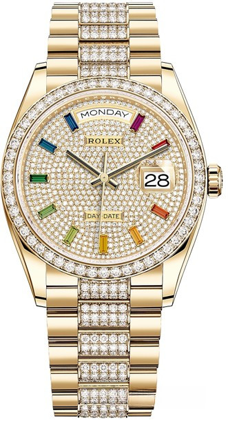 Водостойкие часы Rolex Day-Date Day-Date 36mm Yellow Gold являются официально сертифицированным хронометром COSC, выпущены в круглом корпусе из желтого золота 18к. Размер составляет 36 мм, водонепроницаемость 100 м. Внутри корпуса установлен автоматический механизм. На циферблате с белыми бриллиантами и разноцветными багетными сапфирами отображаются часы, минуты, секунды, дата, день недели. Часы комплектуются браслетом из желтого золота 18к, инкрустированным белыми бриллиантами. Безель из белых бриллиантов.