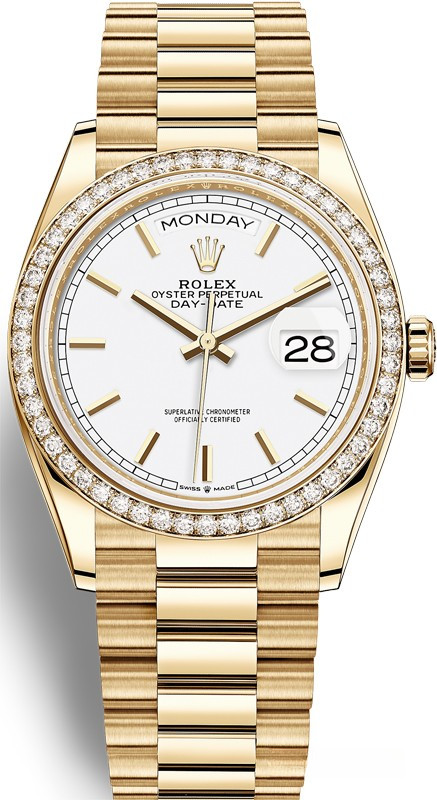Водостойкие часы Rolex Day-Date Day-Date 36mm Yellow Gold являются официально сертифицированным хронометром COSC, выпущены в круглом корпусе из желтого золота 18к. Размер составляет 36 мм, водонепроницаемость 100 м. Внутри корпуса установлен автоматический механизм, Калибр 3255, обладающий запасом хода 70 часов. На белом циферблате отображаются часы, минуты, секунды, дата, день недели. Часы комплектуются браслетом из желтого золота 18к. Безель из белых бриллиантов.