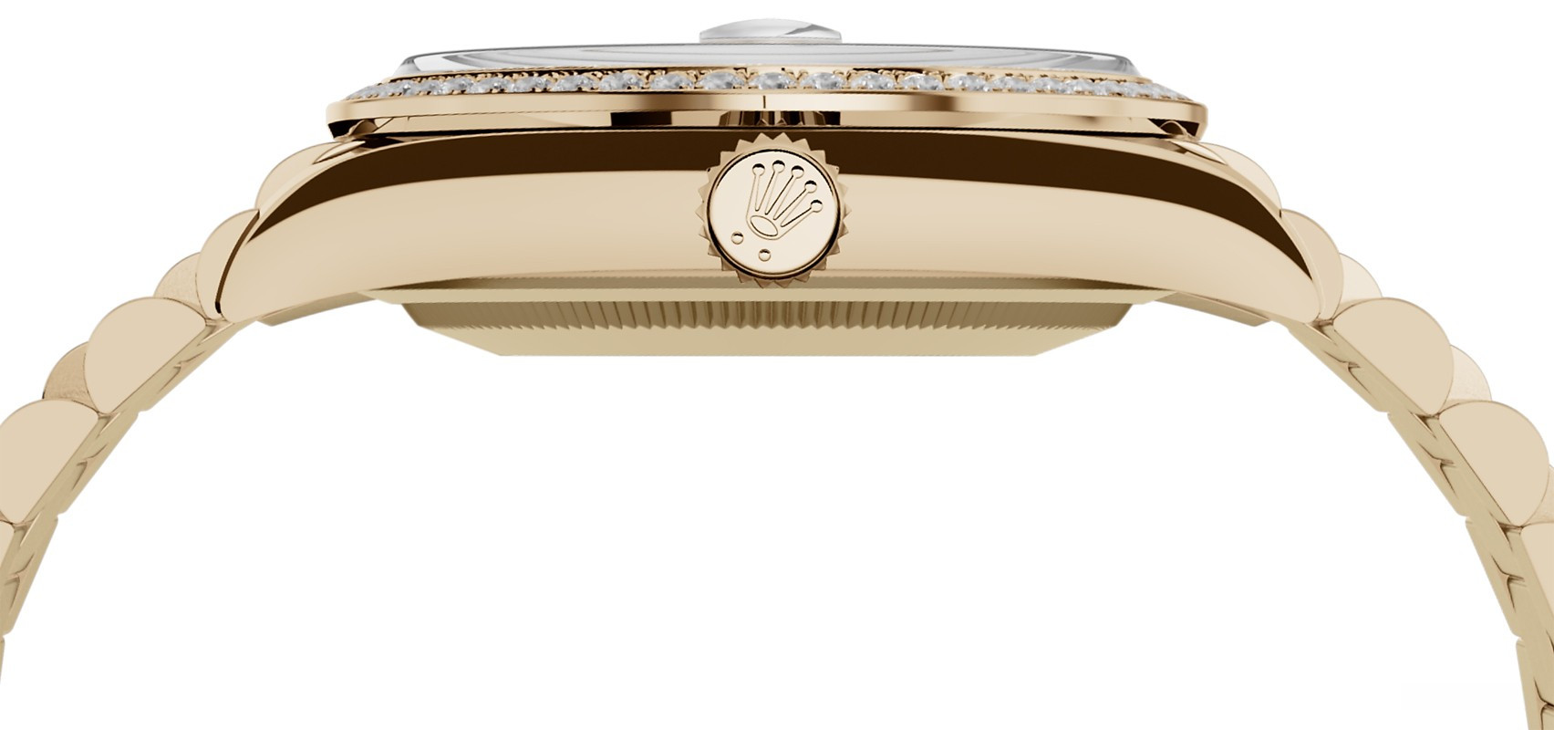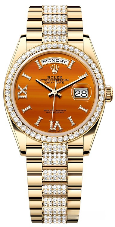 Водостойкие часы Rolex Day-Date 36mm Yellow Gold являются официально сертифицированным хронометром COSC, выпущены в круглом корпусе из желтого золота 18к. Размер составляет 36 мм, водонепроницаемость 100 м. Внутри корпуса установлен автоматический механизм, Калибр 3255, обладающий запасом хода 70 часов. На циферблате из сердолика с белыми бриллиантами отображаются часы, минуты, секунды, дата, день недели. Часы комплектуются браслетом из желтого золота 18к, инкрустированным белыми бриллиантами. Безель избелых бриллиантов.