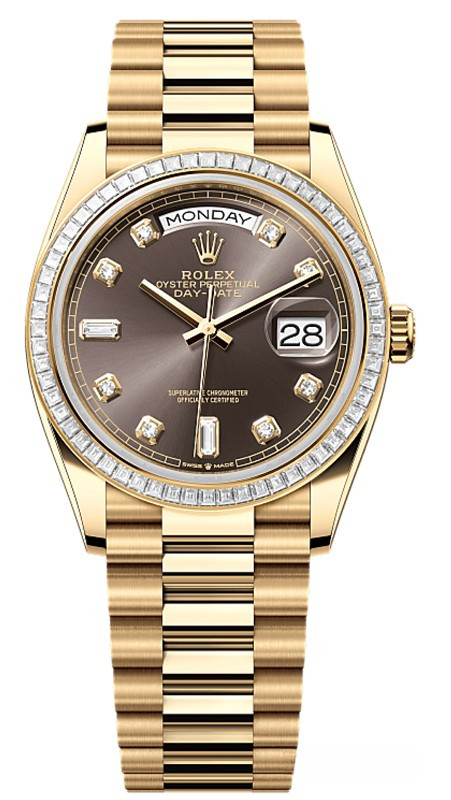 Водостойкие часы Rolex Day-Date 36mm Yellow Gold являются официально сертифицированным хронометром COSC, выпущены в круглом корпусе из желтого золота 18к. Размер составляет 36 мм, водонепроницаемость 100 м. Внутри корпуса установлен автоматический механизм, Калибр 3255, обладающий запасом хода 70 часов. На коричневом циферблате с 10-ю белыми бриллиантами отображаются часы, минуты, секунды, дата, день недели. Часы комплектуются браслетом из желтого золота 18к. Корпус инкрустирован белыми бриллиантами.