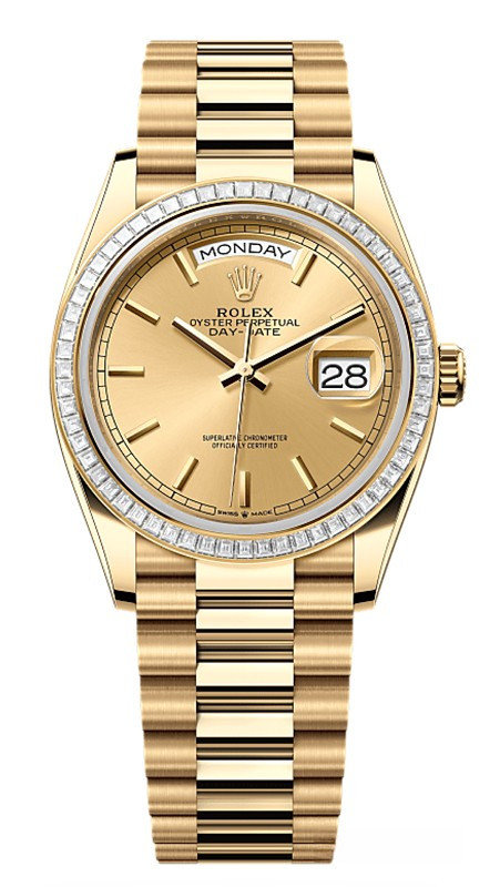 Водостойкие часы Rolex Day-Date 36mm Yellow Gold являются официально сертифицированным хронометром COSC, выпущены в круглом корпусе из желтого золота 18к. Размер составляет 36 мм, водонепроницаемость 100 м. Внутри корпуса установлен автоматический механизм, Калибр 3255, обладающий запасом хода 70 часов. На золотистом циферблате отображаются часы, минуты, секунды, дата, день недели. Часы комплектуются браслетом из желтого золота 18к. Корпус инкрустирован белыми бриллиантами.