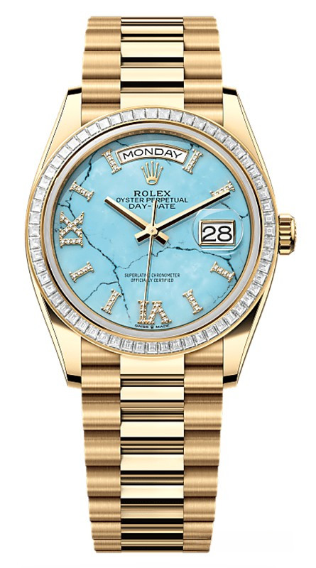 Водостойкие часы Rolex Day-Date 36mm Yellow Gold являются официально сертифицированным хронометром COSC, выпущены в круглом корпусе из желтого золота 18к. Размер составляет 36 мм, водонепроницаемость 100 м. Внутри корпуса установлен автоматический механизм, Калибр 3255, обладающий запасом хода 70 часов. На бирюзовом циферблате с белыми бриллиантами отображаются часы, минуты, секунды, дата, день недели. Часы комплектуются браслетом из желтого золота 18к. Корпус инкрустирован белыми бриллиантами.