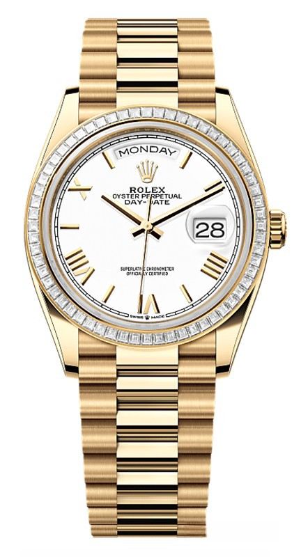 Водостойкие часы Rolex Day-Date 36mm Yellow Gold являются официально сертифицированным хронометром COSC, выпущены в круглом корпусе из желтого золота 18к. Размер составляет 36 мм, водонепроницаемость 100 м. Внутри корпуса установлен автоматический механизм, Калибр 3255, обладающий запасом хода 70 часов. На белом циферблате отображаются часы, минуты, секунды, дата, день недели. Часы комплектуются браслетом из желтого золота 18к. Безель из белых бриллиантов.