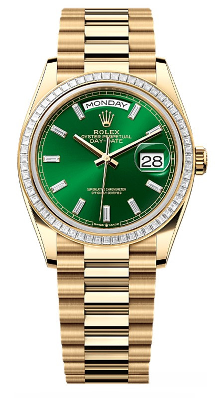 Водостойкие часы Rolex Day-Date 36mm Yellow Gold являются официально сертифицированным хронометром COSC, выпущены в круглом корпусе из желтого золота 18к. Размер составляет 36 мм, водонепроницаемость 100 м. Внутри корпуса установлен автоматический механизм, Калибр 3255, обладающий запасом хода 70 часов. На зеленом циферблате с белыми бриллиантами отображаются часы, минуты, секунды, дата, день недели. Часы комплектуются браслетом из желтого золота 18к. Безель из белых бриллиантов.