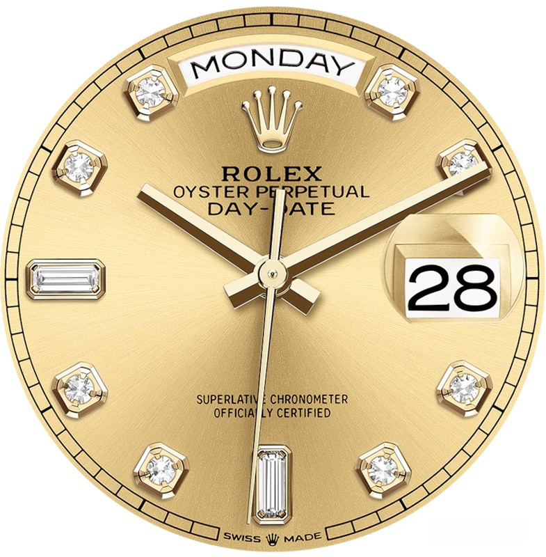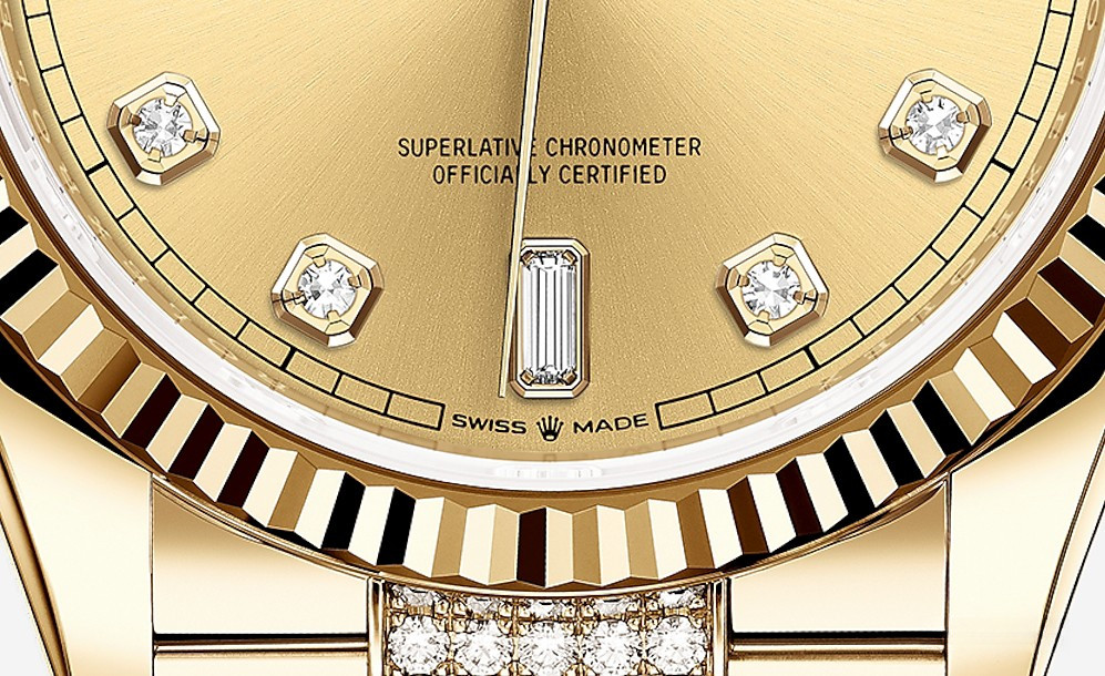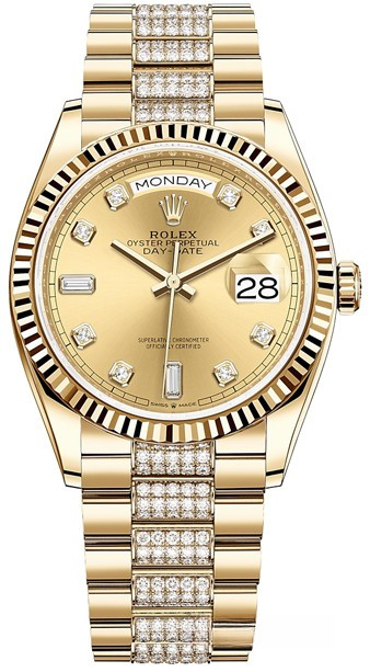 Водостойкие часы Rolex Day-Date Day-Date 36mm Yellow Gold являются официально сертифицированным хронометром COSC, выпущены в круглом корпусе из желтого золота 18к. Размер составляет 36 мм, водонепроницаемость 100 м. Внутри корпуса установлен автоматический механизм. На золотистом циферблате с 10-ю белыми бриллиантами отображаются часы, минуты, секунды, дата, день недели. Часы комплектуются браслетом из желтого золота 18к, инкрустированным белыми бриллиантами.