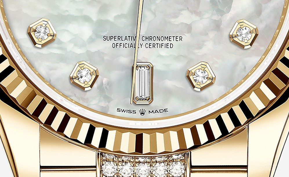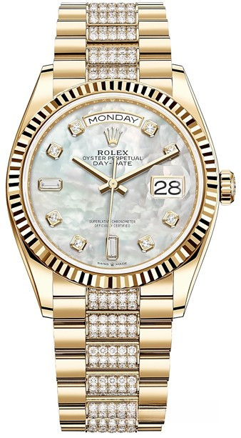 Водостойкие часы Rolex Day-Date Day-Date 36mm Yellow Gold являются официально сертифицированным хронометром COSC, выпущены в круглом корпусе из желтого золота 18к. Размер составляет 36 мм, водонепроницаемость 100 м. Внутри корпуса установлен автоматический механизм. На белом жемчужном циферблате с 10-ю белыми бриллиантами отображаются часы, минуты, секунды, дата, день недели. Часы комплектуются браслетом из желтого золота 18к, инкрустированным белыми бриллиантами.