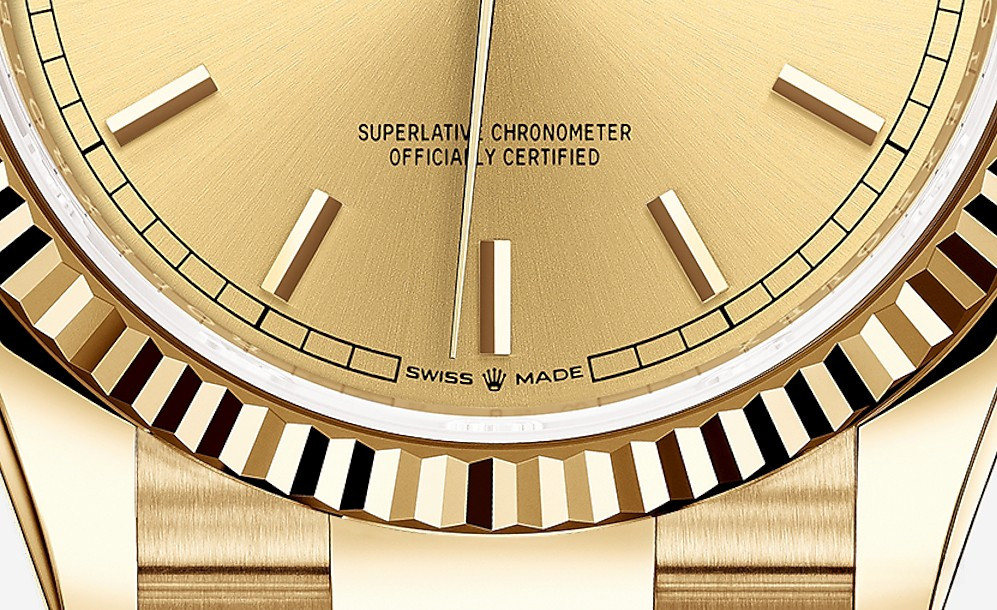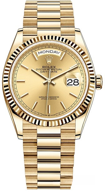 Водостойкие часы Rolex Day-Date Day-Date 36mm Yellow Gold являются официально сертифицированным хронометром COSC, выпущены в круглом корпусе из желтого золота 18к. Размер составляет 36 мм, водонепроницаемость 100 м. Внутри корпуса установлен автоматический механизм. На золотистом циферблате отображаются часы, минуты, секунды, дата, день недели. Часы комплектуются браслетом из желтого золота 18к.