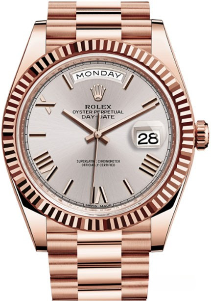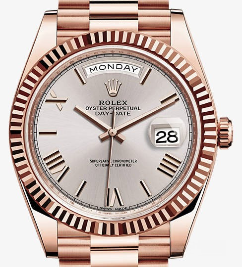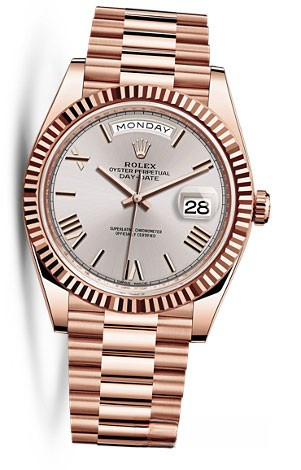 Новая версия Rolex Day-Date изготовлена из розового золота 18к. Модель Day-Date воплощает три основополагающих принципа Ролекса: часы-браслет, водонепроницаемость и хронометр с функцией автоматического подзавода. Day-Date оснащена механизмом нового поколения: калибром 3255, полностью разработанным и изготовленным Ролексом для максимального улучшения характеристик часов. Этот механизм отмечен сертификатом швейцарского хронометра (COSC), который выдается часам, успешно прошедшим тестирование в Официальном швейцарском институте хронометрии. Представляя собой квинтэссенцию передовых технологий Ролекса в часовом искусстве, этот механизм с автоматическим подзаводом отмечен четырнадцатью патентами, что наделяет его существенными преимуществами по таким параметрам, как точность, автономность, ударопрочность, устойчивость к магнитным полям, удобство в использовании и надежность. Благодаря новой архитектуре барабана и более высокой производительности запатентованного хода механизма Chronergy, калибр 3255 отныне обладает запасом хода около 70 часов. Для выполнения классической отделки циферблата была применена деликатная лазерная обработка, с помощью которой удалось достичь редкой по своей сложности и необычности цветопередачи. Часы комплектуются золотым браслетом.