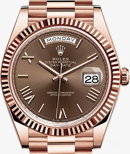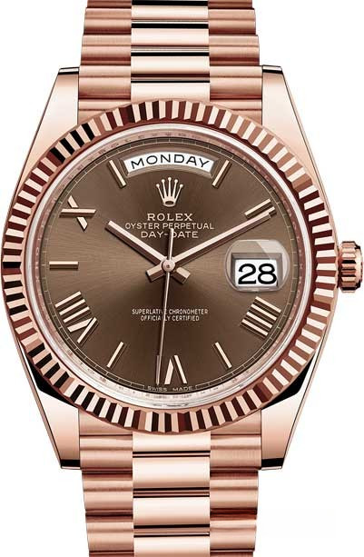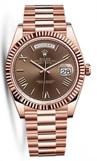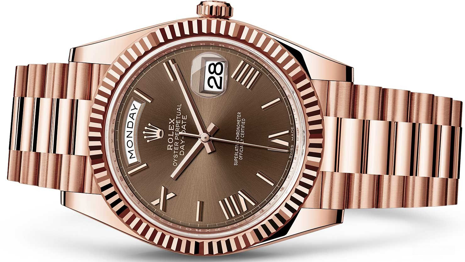 Новая версия Rolex Day-Date изготовлена из розового золота 18к. Модель Day-Date воплощает три основополагающих принципа Ролекса: часы-браслет, водонепроницаемость и хронометр с функцией автоматического подзавода. Day-Date оснащена механизмом нового поколения: калибром 3255, полностью разработанным и изготовленным Ролексом для максимального улучшения характеристик часов. Этот механизм отмечен сертификатом швейцарского хронометра (COSC), который выдается часам, успешно прошедшим тестирование в Официальном швейцарском институте хронометрии. Представляя собой квинтэссенцию передовых технологий Ролекса в часовом искусстве, этот механизм с автоматическим подзаводом отмечен четырнадцатью патентами, что наделяет его существенными преимуществами по таким параметрам, как точность, автономность, ударопрочность, устойчивость к магнитным полям, удобство в использовании и надежность. Благодаря новой архитектуре барабана и более высокой производительности запатентованного хода механизма Chronergy, калибр 3255 отныне обладает запасом хода около 70 часов. Для выполнения классической отделки циферблата была применена деликатная лазерная обработка, с помощью которой удалось достичь редкой по своей сложности и необычности цветопередачи. Часы комплектуются золотым браслетом.