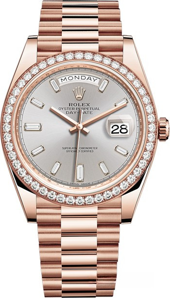 Новая версия Rolex Day-Date изготовлена из розового золота 18к. Модель Day-Date воплощает три основополагающих принципа Ролекса: часы-браслет, водонепроницаемость и хронометр с функцией автоматического подзавода. Day-Date оснащена механизмом нового поколения: калибром 3255, полностью разработанным и изготовленным Ролексом для максимального улучшения характеристик часов. Этот механизм отмечен сертификатом швейцарского хронометра (COSC), который выдается часам, успешно прошедшим тестирование в Официальном швейцарском институте хронометрии. Представляя собой квинтэссенцию передовых технологий Ролекса в часовом искусстве, этот механизм с автоматическим подзаводом отмечен четырнадцатью патентами, что наделяет его существенными преимуществами по таким параметрам, как точность, автономность, ударопрочность, устойчивость к магнитным полям, удобство в использовании и надежность. Благодаря новой архитектуре барабана и более высокой производительности запатентованного хода механизма Chronergy, калибр 3255 отныне обладает запасом хода около 70 часов. Часы комплектуются золотым браслетом.