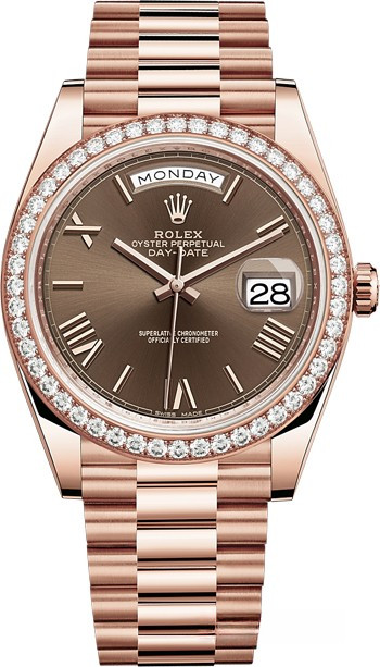 Новая версия Rolex Day-Date изготовлена из розового золота 18к. Модель Day-Date воплощает три основополагающих принципа Ролекса: часы-браслет, водонепроницаемость и хронометр с функцией автоматического подзавода. Day-Date оснащена механизмом нового поколения: калибром 3255, полностью разработанным и изготовленным Ролексом для максимального улучшения характеристик часов. Этот механизм отмечен сертификатом швейцарского хронометра (COSC), который выдается часам, успешно прошедшим тестирование в Официальном швейцарском институте хронометрии. Представляя собой квинтэссенцию передовых технологий Ролекса в часовом искусстве, этот механизм с автоматическим подзаводом отмечен четырнадцатью патентами, что наделяет его существенными преимуществами по таким параметрам, как точность, автономность, ударопрочность, устойчивость к магнитным полям, удобство в использовании и надежность. Благодаря новой архитектуре барабана и более высокой производительности запатентованного хода механизма Chronergy, калибр 3255 отныне обладает запасом хода около 70 часов. Часы комплектуются золотым браслетом.