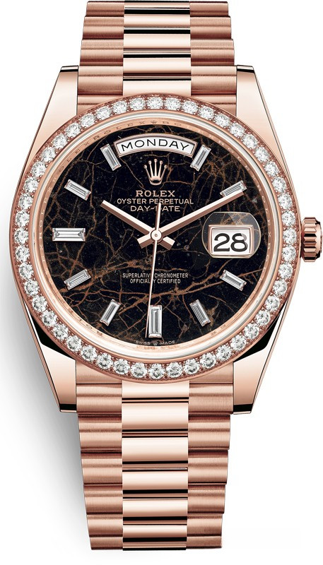 Новая версия Rolex Day-Date изготовлена из розового золота 18к. Модель Day-Date воплощает три основополагающих принципа Ролекса: часы-браслет, водонепроницаемость и хронометр с функцией автоматического подзавода. Day-Date оснащена механизмом нового поколения: калибром 3255, полностью разработанным и изготовленным Ролексом для максимального улучшения характеристик часов. Этот механизм отмечен сертификатом швейцарского хронометра (COSC), который выдается часам, успешно прошедшим тестирование в Официальном швейцарском институте хронометрии. Представляя собой квинтэссенцию передовых технологий Ролекса в часовом искусстве, этот механизм с автоматическим подзаводом отмечен четырнадцатью патентами, что наделяет его существенными преимуществами по таким параметрам, как точность, автономность, ударопрочность, устойчивость к магнитным полям, удобство в использовании и надежность. Благодаря новой архитектуре барабана и более высокой производительности запатентованного хода механизма Chronergy, калибр 3255 отныне обладает запасом хода около 70 часов. Часы комплектуются золотым браслетом. Безель из белых бриллиантов.