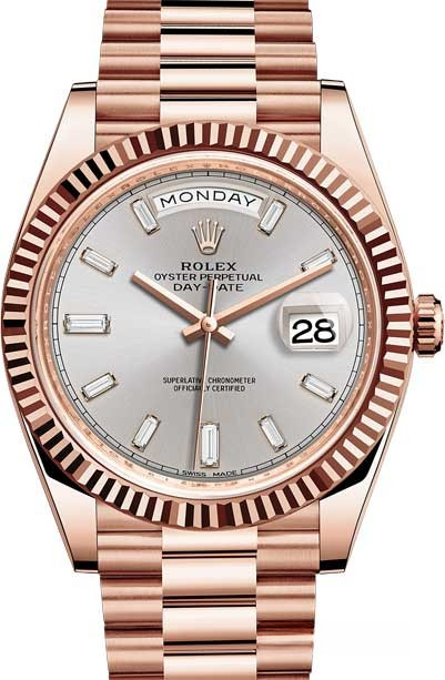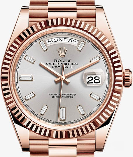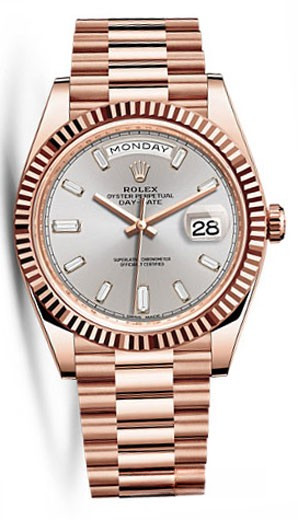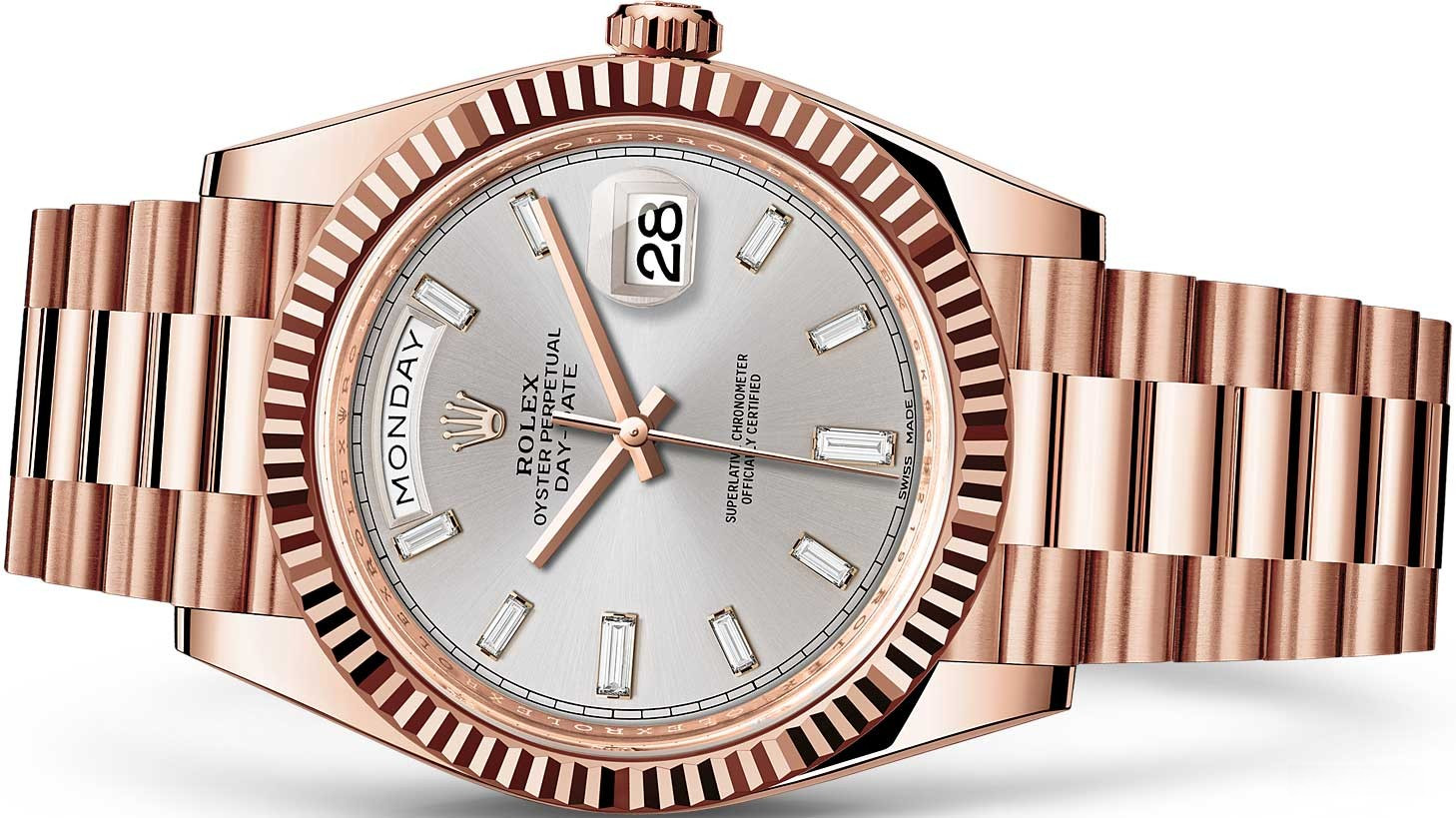 Новая версия Rolex Day-Date изготовлена из розового золота 18к. Модель Day-Date воплощает три основополагающих принципа Ролекса: часы-браслет, водонепроницаемость и хронометр с функцией автоматического подзавода. Day-Date оснащена механизмом нового поколения: калибром 3255, полностью разработанным и изготовленным Ролексом для максимального улучшения характеристик часов. Этот механизм отмечен сертификатом швейцарского хронометра (COSC), который выдается часам, успешно прошедшим тестирование в Официальном швейцарском институте хронометрии. Представляя собой квинтэссенцию передовых технологий Ролекса в часовом искусстве, этот механизм с автоматическим подзаводом отмечен четырнадцатью патентами, что наделяет его существенными преимуществами по таким параметрам, как точность, автономность, ударопрочность, устойчивость к магнитным полям, удобство в использовании и надежность. Благодаря новой архитектуре барабана и более высокой производительности запатентованного хода механизма Chronergy, калибр 3255 отныне обладает запасом хода около 70 часов. Для выполнения классической отделки циферблата была применена деликатная лазерная обработка, с помощью которой удалось достичь редкой по своей сложности и необычности цветопередачи. Часы комплектуются золотым браслетом.