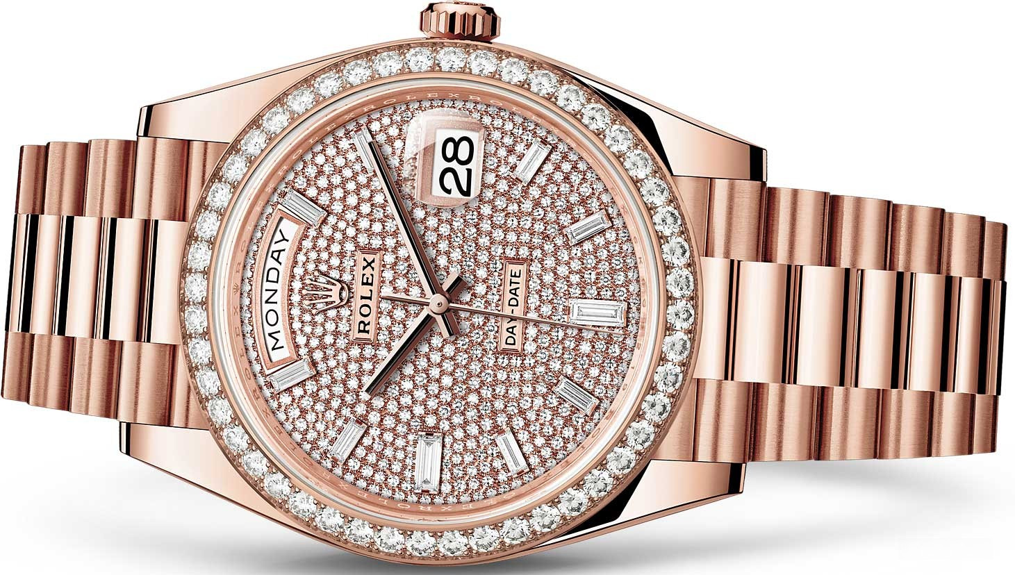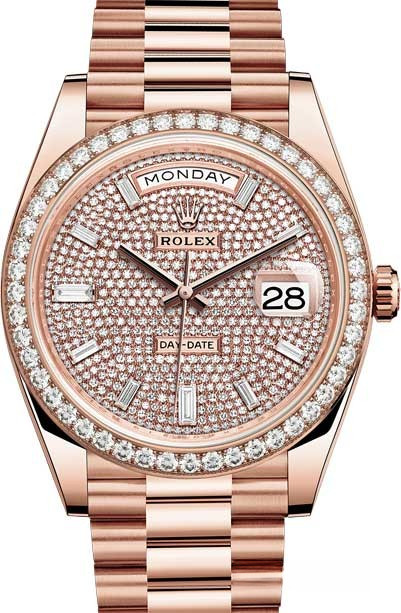 Новая версия Rolex Day-Date изготовлена из розового золота 18к. Модель Day-Date воплощает три основополагающих принципа Ролекса: часы-браслет, водонепроницаемость и хронометр с функцией автоматического подзавода. Day-Date оснащена механизмом нового поколения: калибром 3255, полностью разработанным и изготовленным Ролексом для максимального улучшения характеристик часов. Этот механизм отмечен сертификатом швейцарского хронометра (COSC), который выдается часам, успешно прошедшим тестирование в Официальном швейцарском институте хронометрии. Представляя собой квинтэссенцию передовых технологий Ролекса в часовом искусстве, этот механизм с автоматическим подзаводом отмечен четырнадцатью патентами, что наделяет его существенными преимуществами по таким параметрам, как точность, автономность, ударопрочность, устойчивость к магнитным полям, удобство в использовании и надежность. Благодаря новой архитектуре барабана и более высокой производительности запатентованного хода механизма Chronergy, калибр 3255 отныне обладает запасом хода около 70 часов. Для выполнения классической отделки циферблата была применена деликатная лазерная обработка, с помощью которой удалось достичь редкой по своей сложности и необычности цветопередачи. Часы комплектуются золотым браслетом.