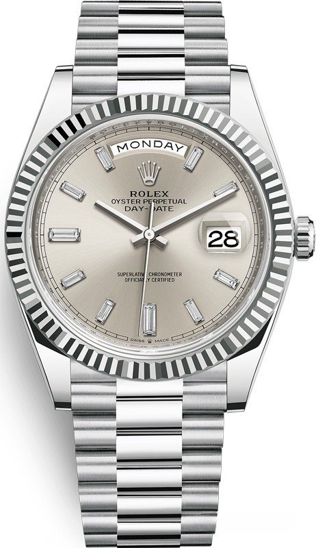 Новая версия Rolex Day-Date изготовлена из платины. Модель Day-Date воплощает три основополагающих принципа Ролекса: часы-браслет, водонепроницаемость и хронометр с функцией автоматического подзавода. Day-Date оснащена механизмом нового поколения: Калибром 3255, полностью разработанным и изготовленным Ролексом для максимального улучшения характеристик часов. Этот механизм отмечен сертификатом швейцарского хронометра (COSC), который выдается часам, успешно прошедшим тестирование в Официальном швейцарском институте хронометрии. Представляя собой квинтэссенцию передовых технологий Ролекса в часовом искусстве, этот механизм с автоматическим подзаводом отмечен четырнадцатью патентами, что наделяет его существенными преимуществами по таким параметрам, как точность, автономность, ударопрочность, устойчивость к магнитным полям, удобство в использовании и надежность. Благодаря новой архитектуре барабана и более высокой производительности запатентованного хода механизма Chronergy, калибр 3255 отныне обладает запасом хода около 70 часов. На серебристом циферблате с 10-ю белыми бриллиантами отображаются часы, минуты, секунды, дата и день недели.