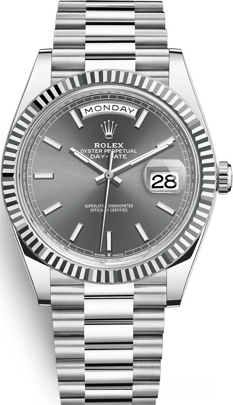 Новая версия Rolex Day-Date изготовлена из платины. Модель Day-Date воплощает три основополагающих принципа Ролекса: часы-браслет, водонепроницаемость и хронометр с функцией автоматического подзавода. Day-Date оснащена механизмом нового поколения: Калибром 3255, полностью разработанным и изготовленным Ролексом для максимального улучшения характеристик часов. Этот механизм отмечен сертификатом швейцарского хронометра (COSC), который выдается часам, успешно прошедшим тестирование в Официальном швейцарском институте хронометрии. Представляя собой квинтэссенцию передовых технологий Ролекса в часовом искусстве, этот механизм с автоматическим подзаводом отмечен четырнадцатью патентами, что наделяет его существенными преимуществами по таким параметрам, как точность, автономность, ударопрочность, устойчивость к магнитным полям, удобство в использовании и надежность. Благодаря новой архитектуре барабана и более высокой производительности запатентованного хода механизма Chronergy, калибр 3255 отныне обладает запасом хода около 70 часов. На сером циферблате отображаются часы, минуты, секунды, дата и день недели.