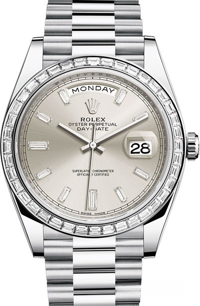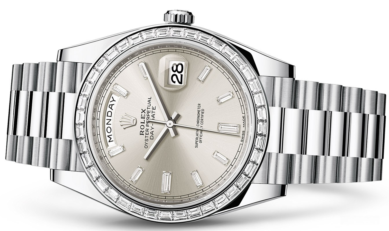 Новая версия Rolex Day-Date изготовлена из платины. Модель Day-Date воплощает три основополагающих принципа Ролекса: часы-браслет, водонепроницаемость и хронометр с функцией автоматического подзавода. Day-Date оснащена механизмом нового поколения: калибром 3255, полностью разработанным и изготовленным Ролексом для максимального улучшения характеристик часов. Этот механизм отмечен сертификатом швейцарского хронометра (COSC), который выдается часам, успешно прошедшим тестирование в Официальном швейцарском институте хронометрии. Представляя собой квинтэссенцию передовых технологий Ролекса в часовом искусстве, этот механизм с автоматическим подзаводом отмечен четырнадцатью патентами, что наделяет его существенными преимуществами по таким параметрам, как точность, автономность, ударопрочность, устойчивость к магнитным полям, удобство в использовании и надежность. Благодаря новой архитектуре барабана и более высокой производительности запатентованного хода механизма Chronergy, калибр 3255 отныне обладает запасом хода около 70 часов. Для выполнения классической отделки циферблата была применена деликатная лазерная обработка, с помощью которой удалось достичь редкой по своей сложности и необычности цветопередачи. На сером циферблате с 10-ю белыми багетными бриллиантами отображаются часы, минуты, секунды, дата и день недели. Безель из белых багетных бриллиантов.
