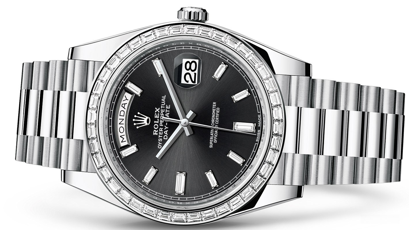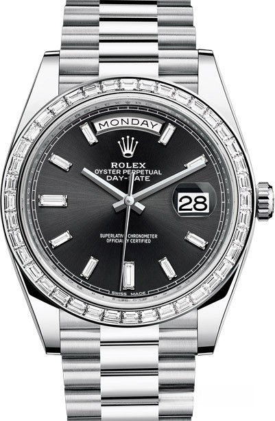 Новая версия Rolex Day-Date изготовлена из платины. Модель Day-Date воплощает три основополагающих принципа Ролекса: часы-браслет, водонепроницаемость и хронометр с функцией автоматического подзавода. Day-Date оснащена механизмом нового поколения: калибром 3255, полностью разработанным и изготовленным Ролексом для максимального улучшения характеристик часов. Этот механизм отмечен сертификатом швейцарского хронометра (COSC), который выдается часам, успешно прошедшим тестирование в Официальном швейцарском институте хронометрии. Представляя собой квинтэссенцию передовых технологий Ролекса в часовом искусстве, этот механизм с автоматическим подзаводом отмечен четырнадцатью патентами, что наделяет его существенными преимуществами по таким параметрам, как точность, автономность, ударопрочность, устойчивость к магнитным полям, удобство в использовании и надежность. Благодаря новой архитектуре барабана и более высокой производительности запатентованного хода механизма Chronergy, калибр 3255 отныне обладает запасом хода около 70 часов. Для выполнения классической отделки циферблата была применена деликатная лазерная обработка, с помощью которой удалось достичь редкой по своей сложности и необычности цветопередачи. На черном циферблате с 10-ю белыми багетными бриллиантами отображаются часы, минуты, секунды, дата и день недели. Безель из белых багетных бриллиантов.