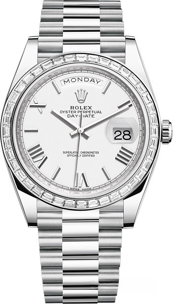 Новая версия Rolex Day-Date изготовлена из платины. Модель Day-Date воплощает три основополагающих принципа Ролекса: часы-браслет, водонепроницаемость и хронометр с функцией автоматического подзавода. Day-Date оснащена механизмом нового поколения: калибром 3255, полностью разработанным и изготовленным Ролексом для максимального улучшения характеристик часов. Этот механизм отмечен сертификатом швейцарского хронометра (COSC), который выдается часам, успешно прошедшим тестирование в Официальном швейцарском институте хронометрии. Представляя собой квинтэссенцию передовых технологий Ролекса в часовом искусстве, этот механизм с автоматическим подзаводом отмечен четырнадцатью патентами, что наделяет его существенными преимуществами по таким параметрам, как точность, автономность, ударопрочность, устойчивость к магнитным полям, удобство в использовании и надежность. Благодаря новой архитектуре барабана и более высокой производительности запатентованного хода механизма Chronergy, калибр 3255 отныне обладает запасом хода около 70 часов. На белом циферблате отображаются часы, минуты, секунды, дата и день недели. Безель из белых багетных бриллиантов.
