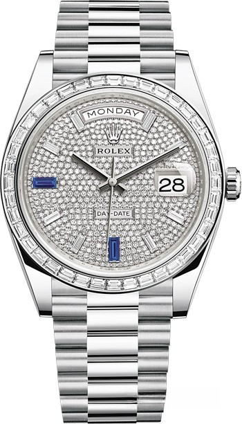 Новая версия Rolex Day-Date изготовлена из платины. Модель Day-Date воплощает три основополагающих принципа Ролекса: часы-браслет, водонепроницаемость и хронометр с функцией автоматического подзавода. Day-Date оснащена механизмом нового поколения: калибром 3255, полностью разработанным и изготовленным Ролексом для максимального улучшения характеристик часов. Этот механизм отмечен сертификатом швейцарского хронометра (COSC), который выдается часам, успешно прошедшим тестирование в Официальном швейцарском институте хронометрии. Представляя собой квинтэссенцию передовых технологий Ролекса в часовом искусстве, этот механизм с автоматическим подзаводом отмечен четырнадцатью патентами, что наделяет его существенными преимуществами по таким параметрам, как точность, автономность, ударопрочность, устойчивость к магнитным полям, удобство в использовании и надежность. Благодаря новой архитектуре барабана и более высокой производительности запатентованного хода механизма Chronergy, калибр 3255 отныне обладает запасом хода около 70 часов. На циферблате из белых бриллиантов с двумя синими багетными сапфирами отображаются часы, минуты, секунды, дата и день недели. Безель из белых багетных бриллиантов.