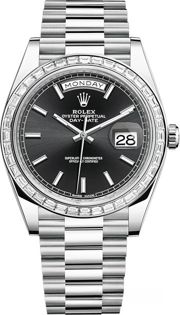 Новая версия Rolex Day-Date изготовлена из платины. Модель Day-Date воплощает три основополагающих принципа Ролекса: часы-браслет, водонепроницаемость и хронометр с функцией автоматического подзавода. Day-Date оснащена механизмом нового поколения: калибром 3255, полностью разработанным и изготовленным Ролексом для максимального улучшения характеристик часов. Этот механизм отмечен сертификатом швейцарского хронометра (COSC), который выдается часам, успешно прошедшим тестирование в Официальном швейцарском институте хронометрии. Представляя собой квинтэссенцию передовых технологий Ролекса в часовом искусстве, этот механизм с автоматическим подзаводом отмечен четырнадцатью патентами, что наделяет его существенными преимуществами по таким параметрам, как точность, автономность, ударопрочность, устойчивость к магнитным полям, удобство в использовании и надежность. Благодаря новой архитектуре барабана и более высокой производительности запатентованного хода механизма Chronergy, калибр 3255 отныне обладает запасом хода около 70 часов. На черном циферблате отображаются часы, минуты, секунды, дата и день недели. Безель из белых багетных бриллиантов.