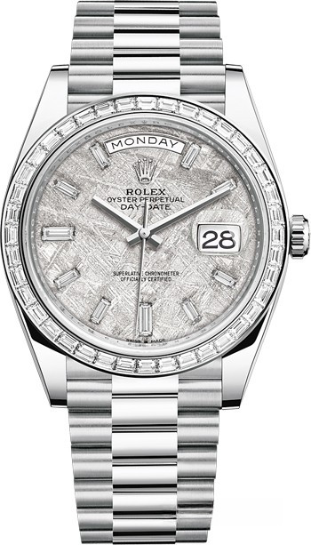 Новая версия Rolex Day-Date изготовлена из платины. Модель Day-Date воплощает три основополагающих принципа Ролекса: часы-браслет, водонепроницаемость и хронометр с функцией автоматического подзавода. Day-Date оснащена механизмом нового поколения: калибром 3255, полностью разработанным и изготовленным Ролексом для максимального улучшения характеристик часов. Этот механизм отмечен сертификатом швейцарского хронометра (COSC), который выдается часам, успешно прошедшим тестирование в Официальном швейцарском институте хронометрии. Представляя собой квинтэссенцию передовых технологий Ролекса в часовом искусстве, этот механизм с автоматическим подзаводом отмечен четырнадцатью патентами, что наделяет его существенными преимуществами по таким параметрам, как точность, автономность, ударопрочность, устойчивость к магнитным полям, удобство в использовании и надежность. Благодаря новой архитектуре барабана и более высокой производительности запатентованного хода механизма Chronergy, калибр 3255 отныне обладает запасом хода около 70 часов. На сером циферблате с 10-ю белыми багетными бриллиантами отображаются часы, минуты, секунды, дата и день недели. Безель из белых багетных бриллиантов.