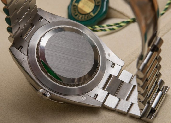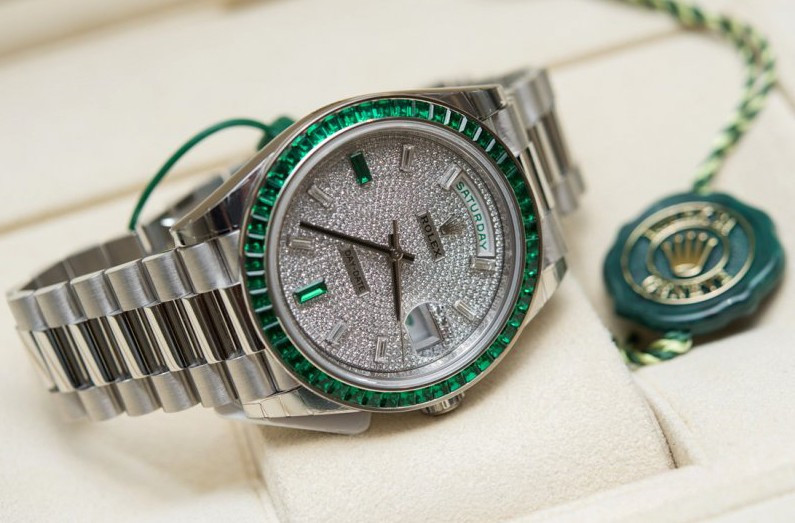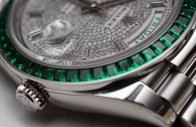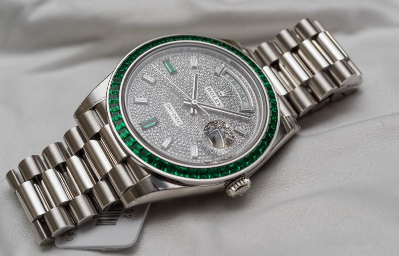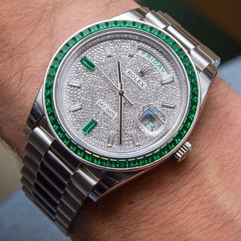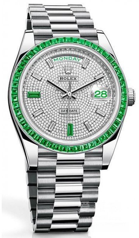Новая версия Rolex Day-Date изготовлена из платины. Модель Day-Date воплощает три основополагающих принципа Ролекса: часы-браслет, водонепроницаемость и хронометр с функцией автоматического подзавода. Day-Date оснащена механизмом нового поколения: Калибром 3255, полностью разработанным и изготовленным Ролексом для максимального улучшения характеристик часов. Этот механизм отмечен сертификатом швейцарского хронометра (COSC), который выдается часам, успешно прошедшим тестирование в Официальном швейцарском институте хронометрии. Представляя собой квинтэссенцию передовых технологий Ролекса в часовом искусстве, этот механизм с автоматическим подзаводом отмечен четырнадцатью патентами, что наделяет его существенными преимуществами по таким параметрам, как точность, автономность, ударопрочность, устойчивость к магнитным полям, удобство в использовании и надежность. Благодаря новой архитектуре барабана и более высокой производительности запатентованного хода механизма Chronergy, Калибр 3255 отныне обладает запасом хода около 70 часов. На циферблате с белыми бриллиантами отображаются часы, минуты, секунды, дата и день недели. Безель из зеленых багетных изумрудов.