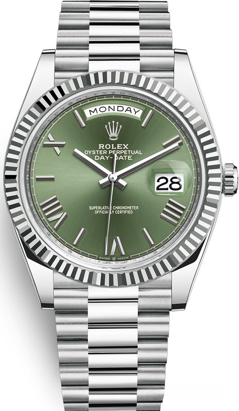 Новая версия Rolex Day-Date изготовлена из платины. Модель Day-Date воплощает три основополагающих принципа Ролекса: часы-браслет, водонепроницаемость и хронометр с функцией автоматического подзавода. Day-Date оснащена механизмом нового поколения: Калибром 3255, полностью разработанным и изготовленным Ролексом для максимального улучшения характеристик часов. Этот механизм отмечен сертификатом швейцарского хронометра (COSC), который выдается часам, успешно прошедшим тестирование в Официальном швейцарском институте хронометрии. Представляя собой квинтэссенцию передовых технологий Ролекса в часовом искусстве, этот механизм с автоматическим подзаводом отмечен четырнадцатью патентами, что наделяет его существенными преимуществами по таким параметрам, как точность, автономность, ударопрочность, устойчивость к магнитным полям, удобство в использовании и надежность. Благодаря новой архитектуре барабана и более высокой производительности запатентованного хода механизма Chronergy, калибр 3255 отныне обладает запасом хода около 70 часов. На зеленом циферблате отображаются часы, минуты, секунды, дата и день недели.