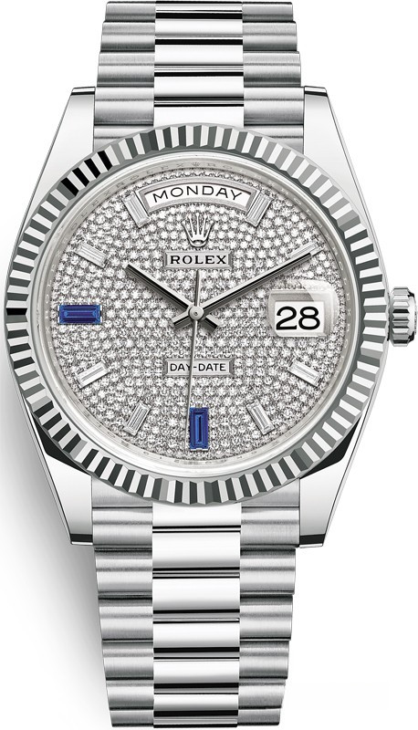 Новая версия Rolex Day-Date изготовлена из платины. Модель Day-Date воплощает три основополагающих принципа Ролекса: часы-браслет, водонепроницаемость и хронометр с функцией автоматического подзавода. Day-Date оснащена механизмом нового поколения: Калибром 3255, полностью разработанным и изготовленным Ролексом для максимального улучшения характеристик часов. Этот механизм отмечен сертификатом швейцарского хронометра (COSC), который выдается часам, успешно прошедшим тестирование в Официальном швейцарском институте хронометрии. Представляя собой квинтэссенцию передовых технологий Ролекса в часовом искусстве, этот механизм с автоматическим подзаводом отмечен четырнадцатью патентами, что наделяет его существенными преимуществами по таким параметрам, как точность, автономность, ударопрочность, устойчивость к магнитным полям, удобство в использовании и надежность. Благодаря новой архитектуре барабана и более высокой производительности запатентованного хода механизма Chronergy, калибр 3255 отныне обладает запасом хода около 70 часов. На циферблате с белыми бриллиантами и синими сапфирами отображаются часы, минуты, секунды, дата и день недели.
