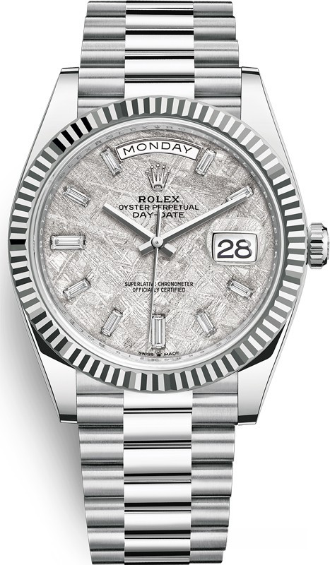 Новая версия Rolex Day-Date изготовлена из платины. Модель Day-Date воплощает три основополагающих принципа Ролекса: часы-браслет, водонепроницаемость и хронометр с функцией автоматического подзавода. Day-Date оснащена механизмом нового поколения: Калибром 3255, полностью разработанным и изготовленным Ролексом для максимального улучшения характеристик часов. Этот механизм отмечен сертификатом швейцарского хронометра (COSC), который выдается часам, успешно прошедшим тестирование в Официальном швейцарском институте хронометрии. Представляя собой квинтэссенцию передовых технологий Ролекса в часовом искусстве, этот механизм с автоматическим подзаводом отмечен четырнадцатью патентами, что наделяет его существенными преимуществами по таким параметрам, как точность, автономность, ударопрочность, устойчивость к магнитным полям, удобство в использовании и надежность. Благодаря новой архитектуре барабана и более высокой производительности запатентованного хода механизма Chronergy, калибр 3255 отныне обладает запасом хода около 70 часов. На циферблате из серго метеорита с 10-ю белыми бриллиантами отображаются часы, минуты, секунды, дата и день недели.