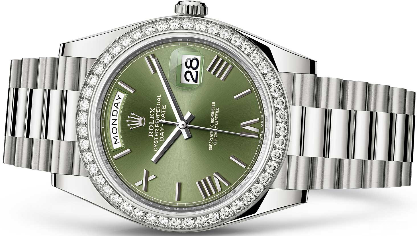 Модель Oyster Perpetual Day-Date, названная «часами для президентов», в 2016 году отмечает свое 60-летие. По этому случаю Ролекс выпускает специальную версию Day-Date 40 с эффектным циферблатом. Новая модель представлена в корпусе из белого золота 18к. Все часы Rolex отныне проходят сертификацию на присвоение статуса Сверхточного Хронометра Rolex, критерии которого были пересмотрены Ролексом в 2015 году. Для проверки показателей точности хода часов в процессе эксплуатации компания Ролекс тестирует часы в собранном виде, что позволяет гарантировать их исключительные характеристики в ходе ношения в том, что касается точности, водонепроницаемости, автоматического подзавода и запаса хода. Циферблат зеленый. Водонепроницаемость корпуса до 100 метров. Часы комплектуются золотым браслетом. Безель из белых бриллиантов.