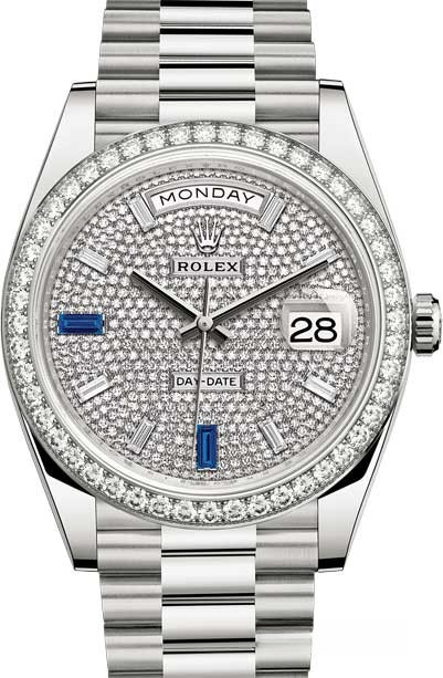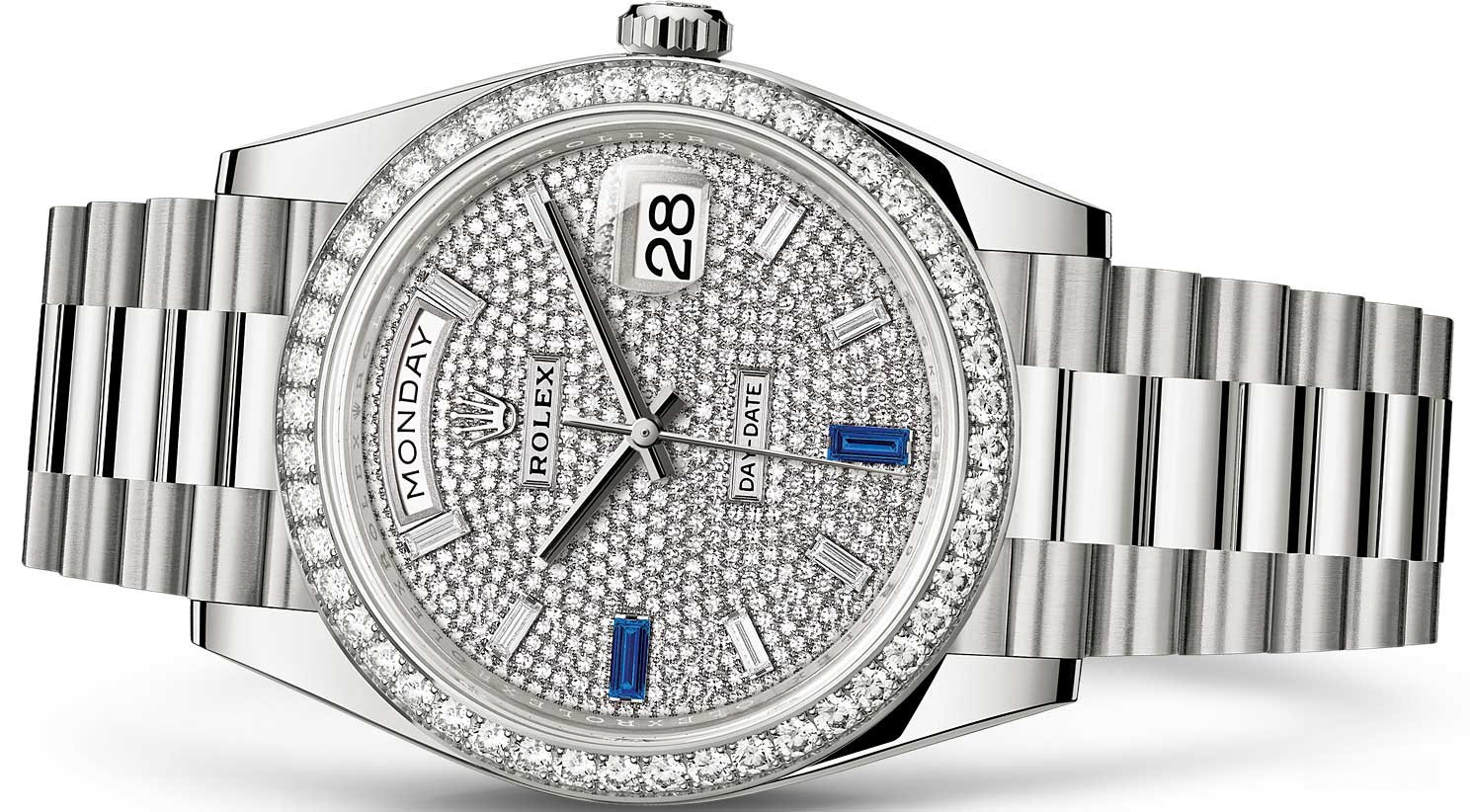 Модель Oyster Perpetual Day-Date, названная «часами для президентов», в 2016 году отмечает свое 60-летие. По этому случаю Ролекс выпускает специальную версию Day-Date 40 с эффектным циферблатом. Новая модель представлена в корпусе из белого золота 18к. Все часы Rolex отныне проходят сертификацию на присвоение статуса Сверхточного Хронометра Rolex, критерии которого были пересмотрены Ролексом в 2015 году. Для проверки показателей точности хода часов в процессе эксплуатации компания Ролекс тестирует часы в собранном виде, что позволяет гарантировать их исключительные характеристики в ходе ношения в том, что касается точности, водонепроницаемости, автоматического подзавода и запаса хода. Циферблат с белыми бриллиантами и 2-мя синими багетными сапфирами. Водонепроницаемость корпуса до 100 метров. Часы комплектуются золотым браслетом. Безель из белых бриллиантов.