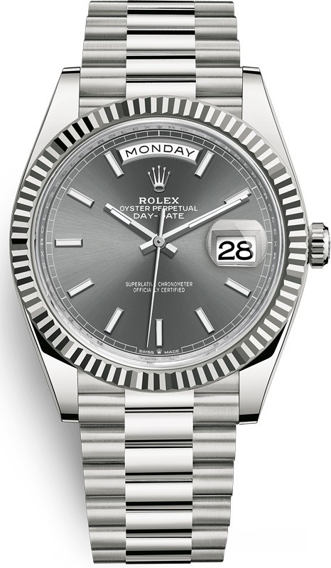 Модель Oyster Perpetual Day-Date представлена в корпусе из белого золота 18к. Все часы Rolex отныне проходят сертификацию на присвоение статуса Сверхточного Хронометра Rolex, критерии которого были пересмотрены Ролексом в 2015 году. Для проверки показателей точности хода часов в процессе эксплуатации компания Ролекс тестирует часы в собранном виде, что позволяет гарантировать их исключительные характеристики в ходе ношения в том, что касается точности, водонепроницаемости, автоматического подзавода и запаса хода. Циферблат серый. Водонепроницаемость корпуса до 100 метров. Часы комплектуются золотым браслетом.