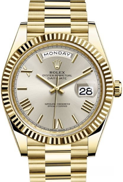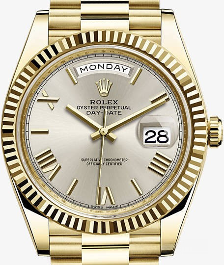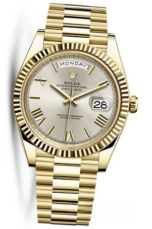 Новая версия Rolex Day-Date изготовлена из желтого золота 18к. Модель Day-Date воплощает три основополагающих принципа Ролекса: часы-браслет, водонепроницаемость и хронометр с функцией автоматического подзавода. Day-Date оснащена механизмом нового поколения: калибром 3255, полностью разработанным и изготовленным Ролексом для максимального улучшения характеристик часов. Этот механизм отмечен сертификатом швейцарского хронометра (COSC), который выдается часам, успешно прошедшим тестирование в Официальном швейцарском институте хронометрии. Представляя собой квинтэссенцию передовых технологий Ролекса в часовом искусстве, этот механизм с автоматическим подзаводом отмечен четырнадцатью патентами, что наделяет его существенными преимуществами по таким параметрам, как точность, автономность, ударопрочность, устойчивость к магнитным полям, удобство в использовании и надежность. Благодаря новой архитектуре барабана и более высокой производительности запатентованного хода механизма Chronergy, калибр 3255 отныне обладает запасом хода около 70 часов. Для выполнения классической отделки циферблата была применена деликатная лазерная обработка, с помощью которой удалось достичь редкой по своей сложности и необычности цветопередачи. Часы комплектуются золотым браслетом.
