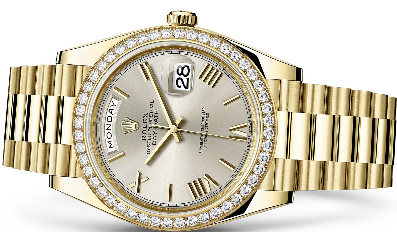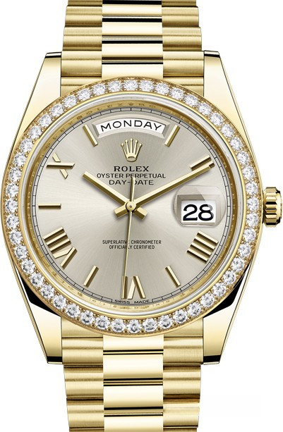 Модель Rolex Day-Date 40 mm Yellow Gold представлена в корпусе из желтого золота 18к диаметром 40 мм. Все часы Rolex отныне проходят сертификацию на присвоение статуса Сверхточного Хронометра Rolex, критерии которого были пересмотрены Ролексом в 2015 году. Для проверки показателей точности хода часов в процессе эксплуатации компания Ролекс тестирует часы в собранном виде, что позволяет гарантировать их исключительные характеристики в ходе ношения в том, что касается точности, водонепроницаемости, автоматического подзавода и запаса хода. На серебристом циферблате отображаются часы, минуты, секунды, дата, день недели. Водонепроницаемость корпуса до 100 метров. Внутри корпуса установлен автоматический механизм с запасом хода 48 часов. Часы комплектуются золотым браслетом. Безель из белых бриллиантов.