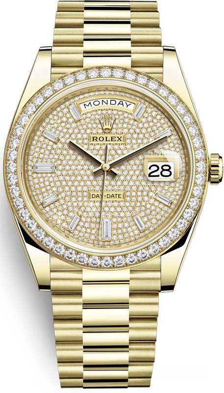 Модель Rolex Day-Date 40 mm Yellow Gold представлена в корпусе из желтого золота 18к диаметром 40 мм. Все часы Rolex отныне проходят сертификацию на присвоение статуса Сверхточного Хронометра Rolex, критерии которого были пересмотрены Ролексом в 2015 году. Для проверки показателей точности хода часов в процессе эксплуатации компания Ролекс тестирует часы в собранном виде, что позволяет гарантировать их исключительные характеристики в ходе ношения в том, что касается точности, водонепроницаемости, автоматического подзавода и запаса хода. На циферблате с белыми бриллиантами отображаются часы, минуты, секунды, дата, день недели. Водонепроницаемость корпуса до 100 метров. Внутри корпуса установлен автоматический механизм с запасом хода 70часов. Часы комплектуются золотым браслетом. Безель из белых бриллиантов.