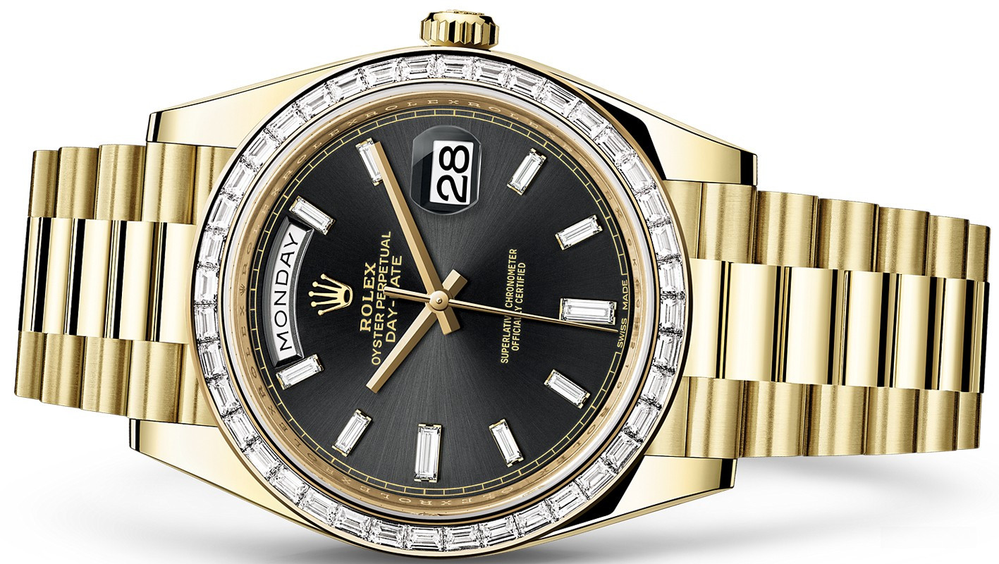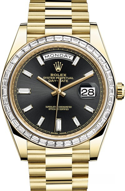 Модель Rolex Day-Date 40 mm Yellow Gold представлена в корпусе из желтого золота 18к диаметром 40 мм. Все часы Rolex отныне проходят сертификацию на присвоение статуса Сверхточного Хронометра Rolex, критерии которого были пересмотрены Ролексом в 2015 году. Для проверки показателей точности хода часов в процессе эксплуатации компания Ролекс тестирует часы в собранном виде, что позволяет гарантировать их исключительные характеристики в ходе ношения в том, что касается точности, водонепроницаемости, автоматического подзавода и запаса хода. На черном циферблате с 10-ю белыми багетными бриллиантами отображаются часы, минуты, секунды, дата, день недели. Водонепроницаемость корпуса до 100 метров. Внутри корпуса установлен автоматический механизм с запасом хода 48 часов. Часы комплектуются золотым браслетом. Безель из белых багетных бриллиантов.