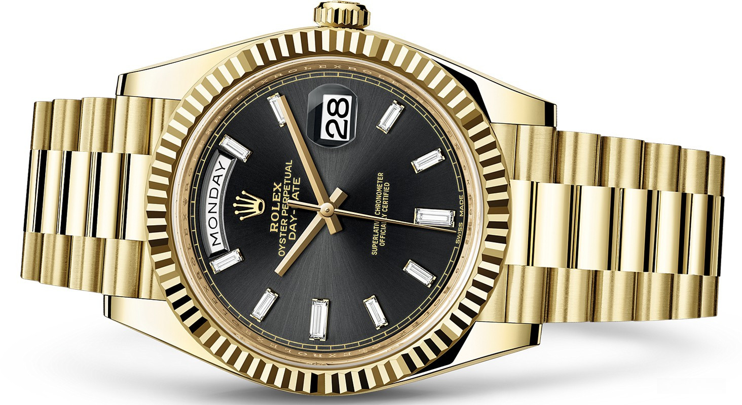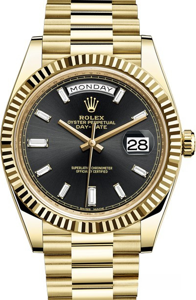 Модель Rolex Day-Date 40 mm Yellow Gold представлена в корпусе из желтого золота 18к диаметром 40 мм. Все часы Rolex отныне проходят сертификацию на присвоение статуса Сверхточного Хронометра Rolex, критерии которого были пересмотрены Ролексом в 2015 году. Для проверки показателей точности хода часов в процессе эксплуатации компания Ролекс тестирует часы в собранном виде, что позволяет гарантировать их исключительные характеристики в ходе ношения в том, что касается точности, водонепроницаемости, автоматического подзавода и запаса хода. На черном циферблате с 10-ю белыми багетными бриллиантами отображаются часы, минуты, секунды, дата, день недели. Водонепроницаемость корпуса до 100 метров. Внутри корпуса установлен автоматический механизм с запасом хода 48 часов. Часы комплектуются золотым браслетом.