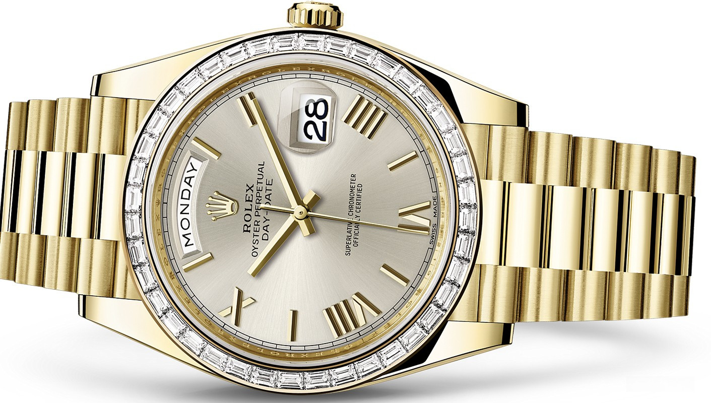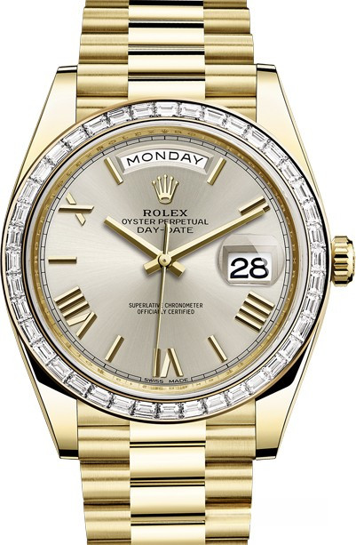 Модель Rolex Day-Date 40 mm Yellow Gold представлена в корпусе из желтого золота 18к диаметром 40 мм. Все часы Rolex отныне проходят сертификацию на присвоение статуса Сверхточного Хронометра Rolex, критерии которого были пересмотрены Ролексом в 2015 году. Для проверки показателей точности хода часов в процессе эксплуатации компания Ролекс тестирует часы в собранном виде, что позволяет гарантировать их исключительные характеристики в ходе ношения в том, что касается точности, водонепроницаемости, автоматического подзавода и запаса хода. На серебристом циферблате отображаются часы, минуты, секунды, дата, день недели. Водонепроницаемость корпуса до 100 метров. Внутри корпуса установлен автоматический механизм с запасом хода 48 часов. Часы комплектуются золотым браслетом. Безель из белых багетных бриллиантов.