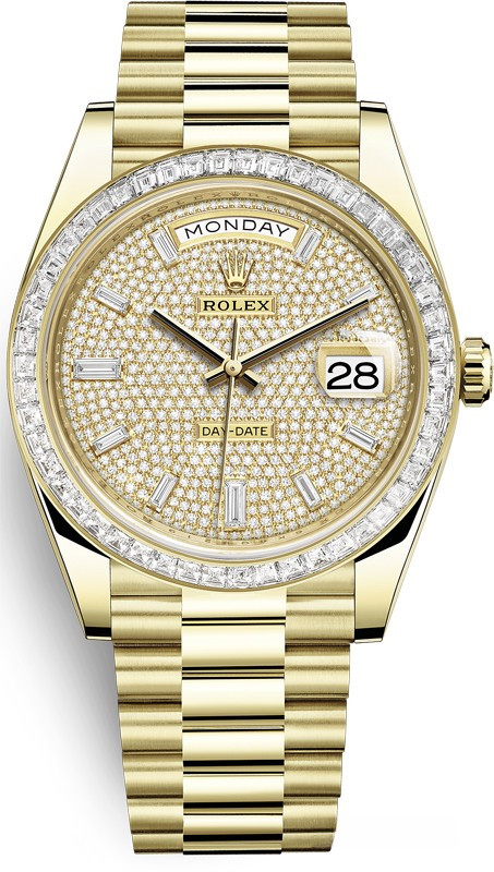 Модель Rolex Day-Date 40 mm Yellow Gold представлена в корпусе из желтого золота 18к диаметром 40 мм. Все часы Rolex отныне проходят сертификацию на присвоение статуса Сверхточного Хронометра Rolex, критерии которого были пересмотрены Ролексом в 2015 году. Для проверки показателей точности хода часов в процессе эксплуатации компания Ролекс тестирует часы в собранном виде, что позволяет гарантировать их исключительные характеристики в ходе ношения в том, что касается точности, водонепроницаемости, автоматического подзавода и запаса хода. На циферблате с белыми бриллиантами отображаются часы, минуты, секунды, дата, день недели. Водонепроницаемость корпуса до 100 метров. Внутри корпуса установлен автоматический механизм с запасом хода 70часов. Часы комплектуются золотым браслетом. Безель из белых бриллиантов.