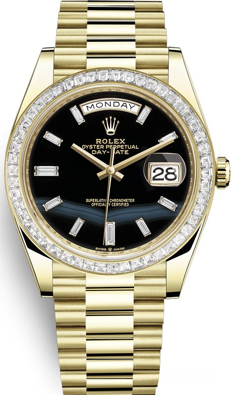 Модель Rolex Day-Date 40 mm Yellow Gold представлена в корпусе из желтого золота 18к диаметром 40 мм. Все часы Rolex отныне проходят сертификацию на присвоение статуса Сверхточного Хронометра Rolex, критерии которого были пересмотрены Ролексом в 2015 году. Для проверки показателей точности хода часов в процессе эксплуатации компания Ролекс тестирует часы в собранном виде, что позволяет гарантировать их исключительные характеристики в ходе ношения в том, что касается точности, водонепроницаемости, автоматического подзавода и запаса хода. На черном циферблате с 10-ю белыми бриллиантами отображаются часы, минуты, секунды, дата, день недели. Водонепроницаемость корпуса до 100 метров. Внутри корпуса установлен автоматический механизм с запасом хода 70часов. Часы комплектуются золотым браслетом. Безель из белых бриллиантов.