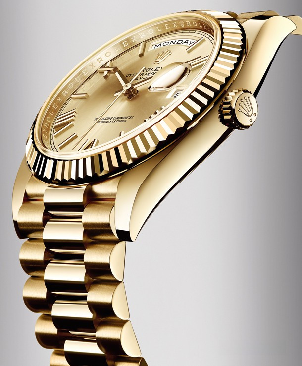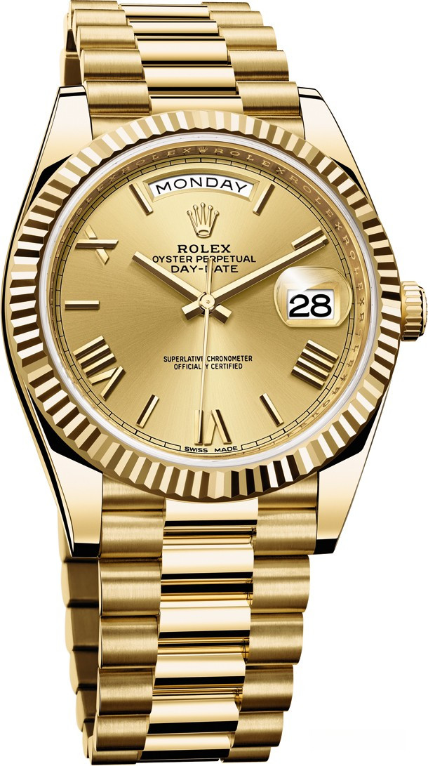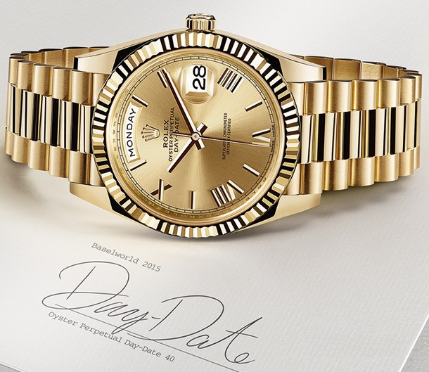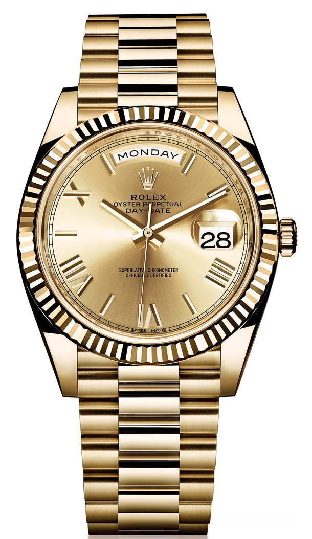 Новая версия Rolex Day-Date изготовлена из желтого золота 18к. Модель Day-Date воплощает три основополагающих принципа Ролекса: часы-браслет, водонепроницаемость и хронометр с функцией автоматического подзавода. Day-Date оснащена механизмом нового поколения: калибром 3255, полностью разработанным и изготовленным Ролексом для максимального улучшения характеристик часов. Этот механизм отмечен сертификатом швейцарского хронометра (COSC), который выдается часам, успешно прошедшим тестирование в Официальном швейцарском институте хронометрии. Представляя собой квинтэссенцию передовых технологий Ролекса в часовом искусстве, этот механизм с автоматическим подзаводом отмечен четырнадцатью патентами, что наделяет его существенными преимуществами по таким параметрам, как точность, автономность, ударопрочность, устойчивость к магнитным полям, удобство в использовании и надежность. Благодаря новой архитектуре барабана и более высокой производительности запатентованного хода механизма Chronergy, калибр 3255 отныне обладает запасом хода около 70 часов. Для выполнения классической отделки циферблата была применена деликатная лазерная обработка, с помощью которой удалось достичь редкой по своей сложности и необычности цветопередачи.