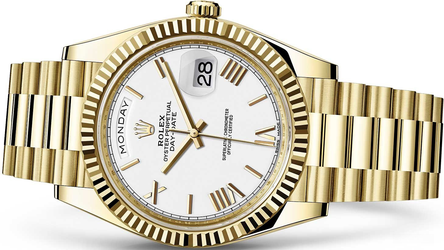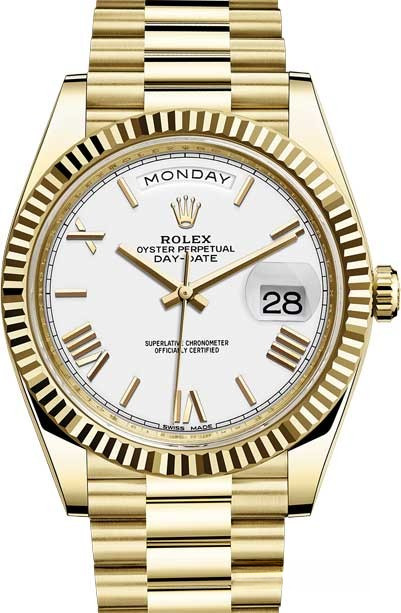 Модель Rolex Day-Date 40 mm Yellow Gold представлена в корпусе из желтого золота 18к диаметром 40 мм. Все часы Rolex отныне проходят сертификацию на присвоение статуса Сверхточного Хронометра Rolex, критерии которого были пересмотрены Ролексом в 2015 году. Для проверки показателей точности хода часов в процессе эксплуатации компания Ролекс тестирует часы в собранном виде, что позволяет гарантировать их исключительные характеристики в ходе ношения в том, что касается точности, водонепроницаемости, автоматического подзавода и запаса хода. На белом циферблате отображаются часы, минуты, секунды, дата, день недели. Водонепроницаемость корпуса до 100 метров. Внутри корпуса установлен автоматический механизм с запасом хода 48 часов. Часы комплектуются золотым браслетом.
