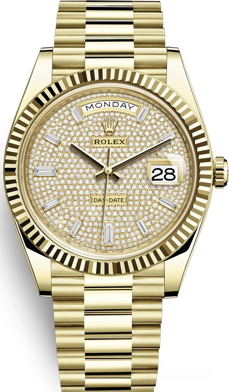 Модель Rolex Day-Date 40 mm Yellow Gold представлена в корпусе из желтого золота 18к диаметром 40 мм. Все часы Rolex отныне проходят сертификацию на присвоение статуса Сверхточного Хронометра Rolex, критерии которого были пересмотрены Ролексом в 2015 году. Для проверки показателей точности хода часов в процессе эксплуатации компания Ролекс тестирует часы в собранном виде, что позволяет гарантировать их исключительные характеристики в ходе ношения в том, что касается точности, водонепроницаемости, автоматического подзавода и запаса хода. На циферблате с белыми бриллиантами отображаются часы, минуты, секунды, дата, день недели. Водонепроницаемость корпуса до 100 метров. Внутри корпуса установлен автоматический механизм с запасом хода 70часов. Часы комплектуются золотым браслетом.