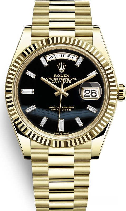 Модель Rolex Day-Date 40 mm Yellow Gold представлена в корпусе из желтого золота 18к диаметром 40 мм. Все часы Rolex отныне проходят сертификацию на присвоение статуса Сверхточного Хронометра Rolex, критерии которого были пересмотрены Ролексом в 2015 году. Для проверки показателей точности хода часов в процессе эксплуатации компания Ролекс тестирует часы в собранном виде, что позволяет гарантировать их исключительные характеристики в ходе ношения в том, что касается точности, водонепроницаемости, автоматического подзавода и запаса хода. На черном циферблате с 10-ю белыми бриллиантами отображаются часы, минуты, секунды, дата, день недели. Водонепроницаемость корпуса до 100 метров. Внутри корпуса установлен автоматический механизм с запасом хода 70часов. Часы комплектуются золотым браслетом.